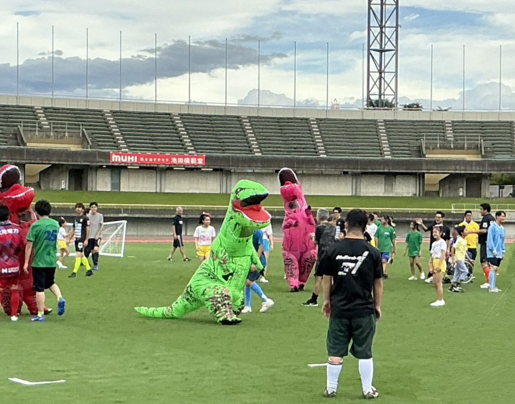 午後の第1部は、小さいお子さんも参加できるような着ぐるみの恐竜と鬼ごっこのようなサッカーやトーナメント戦を行いました。