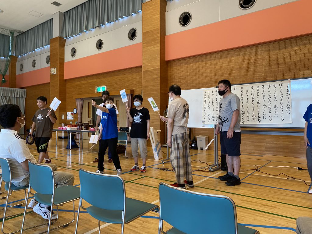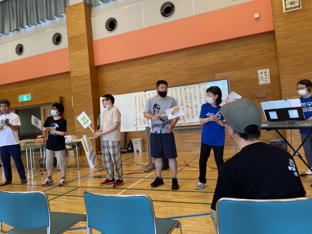 先生が、ミミズやミツバチ、あめんぼなどの生き物の絵をプラカードにして持ってこられました。なんでしょうか?そうです。今季のNHKの朝ドラ「あんぱん」にちなんで、やなせたかしさんの作詞、いずみたく作曲の 「手のひらを太陽に」に出てくる生き物です。 中野先生の伴奏で歌いながら、間違えずに自分のカードを出せるかな?挑戦したいアスリートにプラカードが渡され、曲が始まりました。