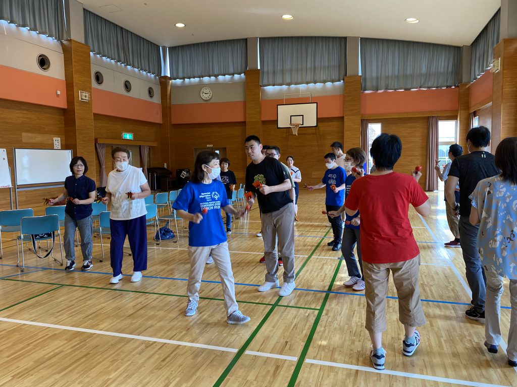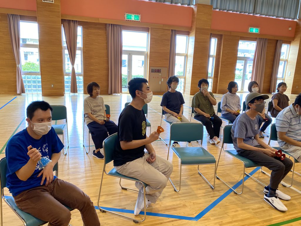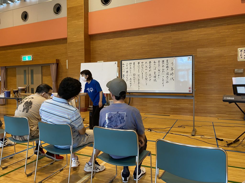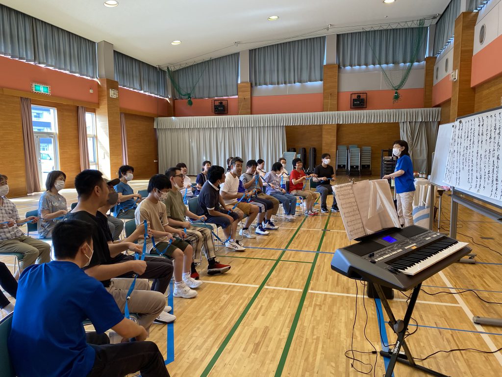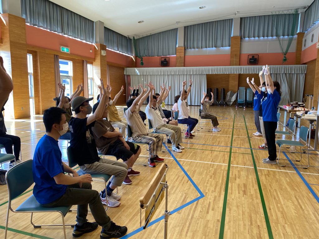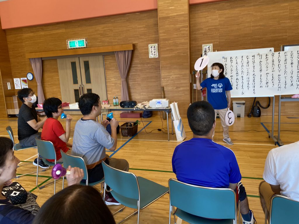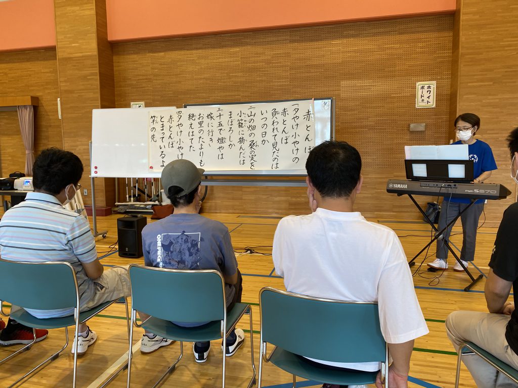 6月は、「かたつむり」、7月は「うみ」、8月は「たなばたさま」(富山では、七夕祭りを8月にする地域が多いです)、9月は「赤とんぼ」という具合に、老若男女だれでも知っている、季節感あふれる歌で、始まります。歌を歌う前に、「今日は、○○の歌?」と予想をたててくるアスリート多数。