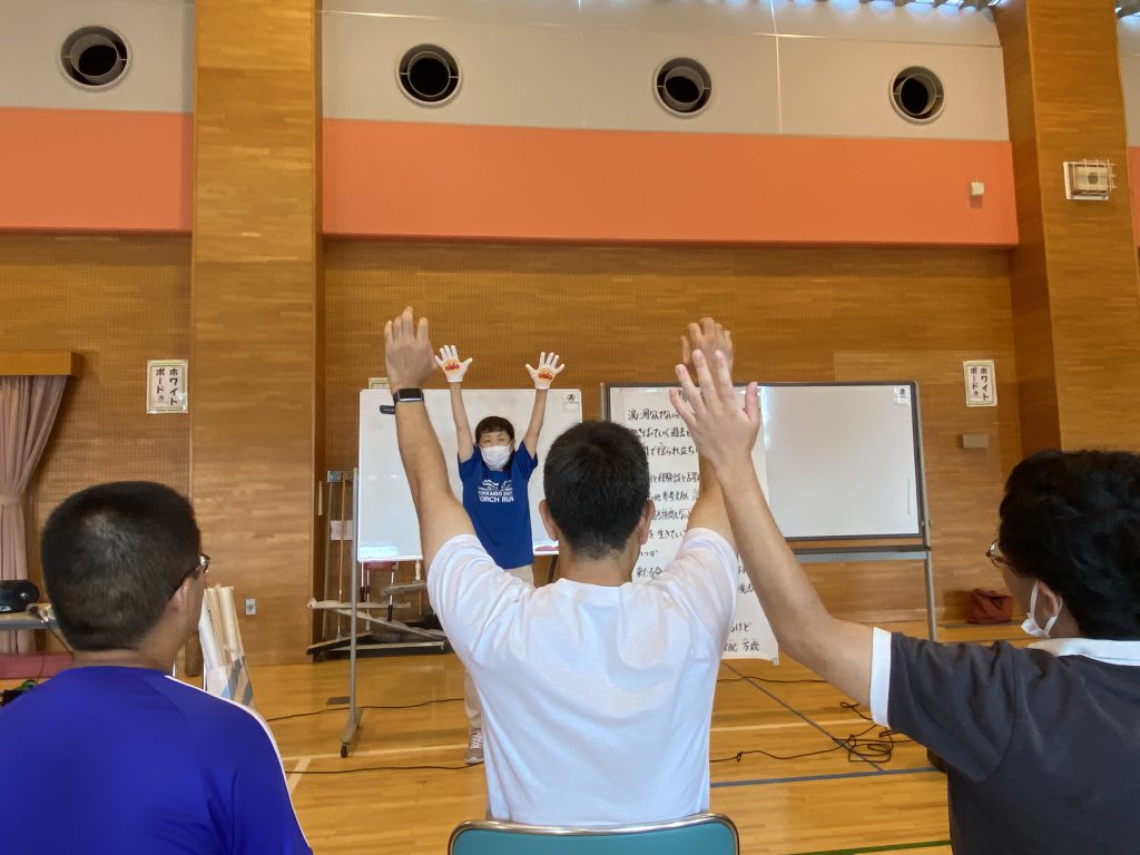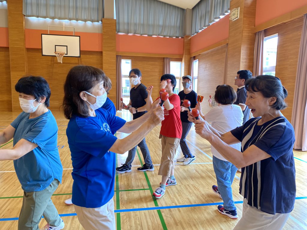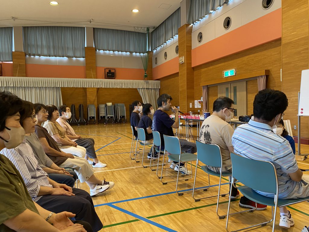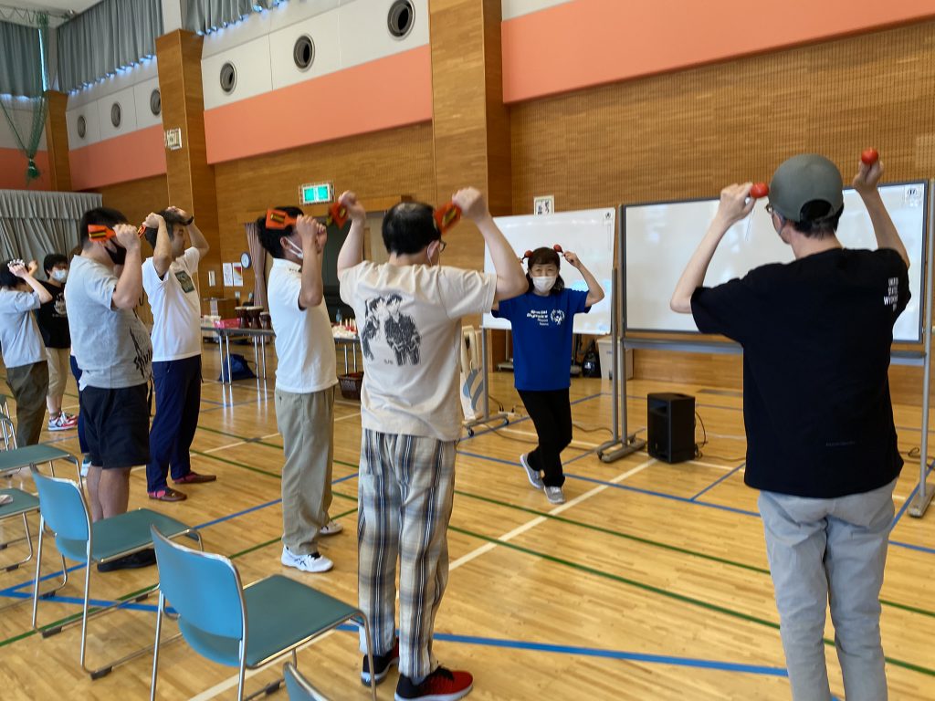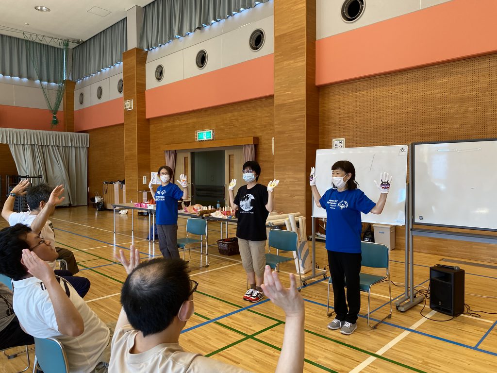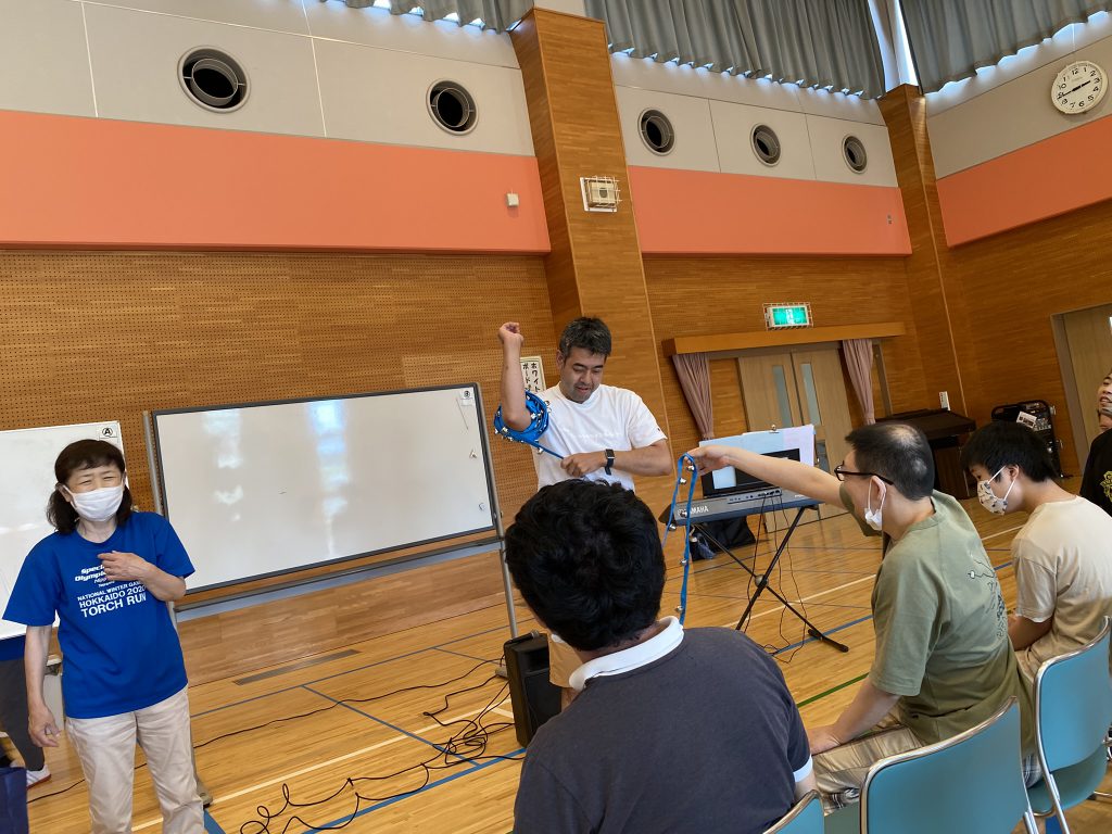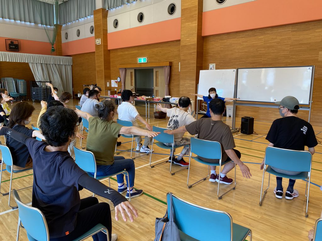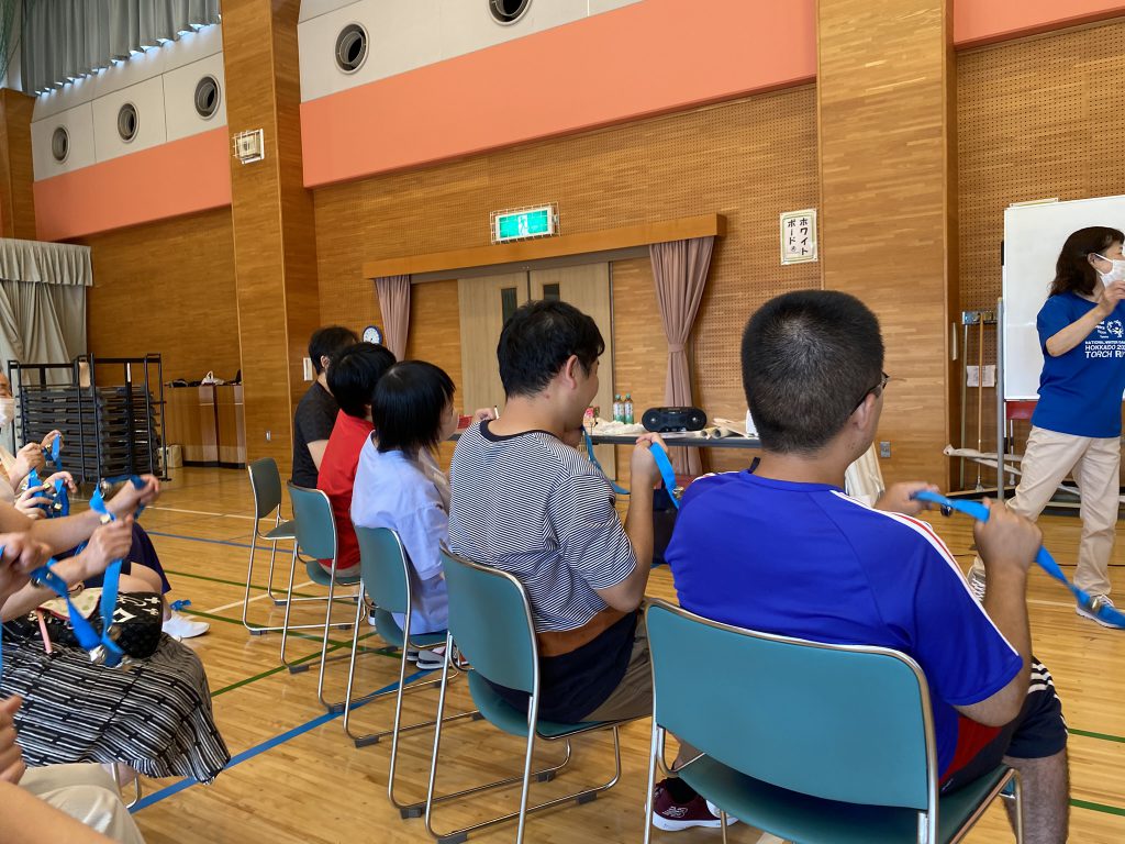 6月は、「かたつむり」、7月は「うみ」、8月は「たなばたさま」(富山では、七夕祭りを8月にする地域が多いです)、9月は「赤とんぼ」という具合に、老若男女だれでも知っている、季節感あふれる歌で、始まります。歌を歌う前に、「今日は、○○の歌?」と予想をたててくるアスリート多数。