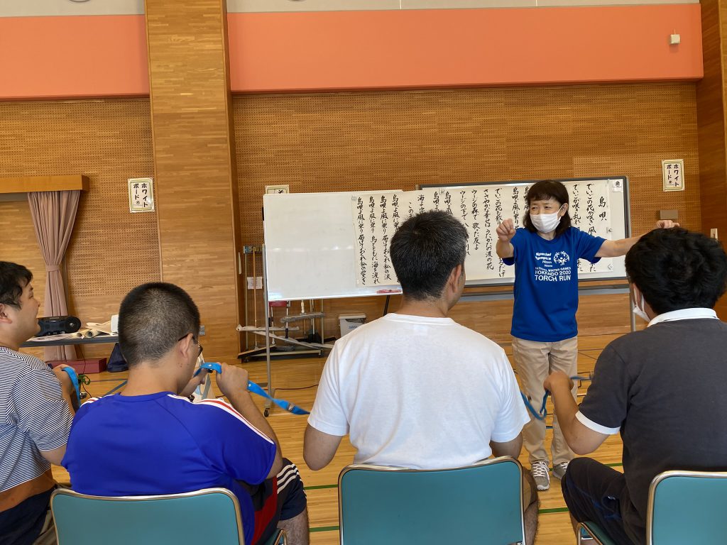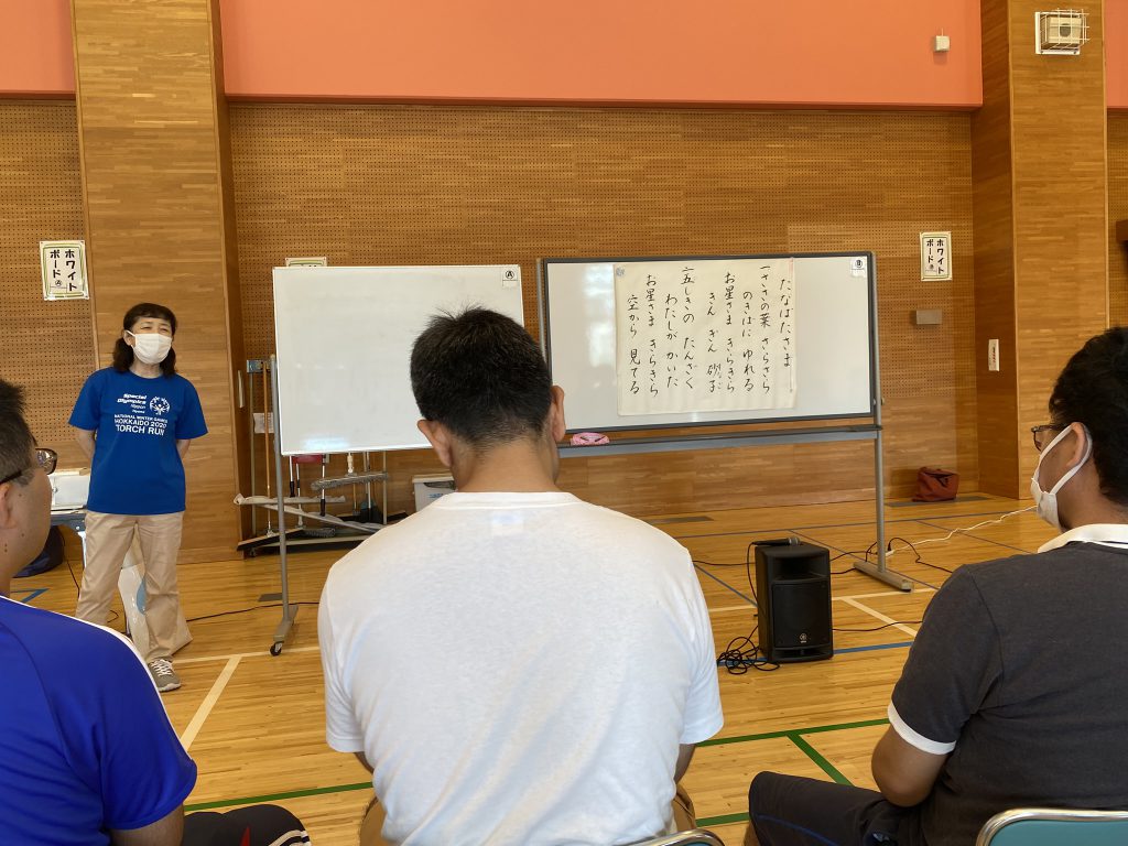 作曲は、道下先生 、作詞は、SON・富山会員から広く言葉を募集して作られました。今まで トーチラン など、ナショナルゲーム、ワールドゲーム、地区大会に出場するメンバーを応援するイベントの際に、歌ったり、曲をかけたりしていますが、文化プログラムでも必ず最後に歌っています。数年前からは、歌う際に、手話もつけるようになりました。こちらは、中野先生の手話を見て、皆、練習中。