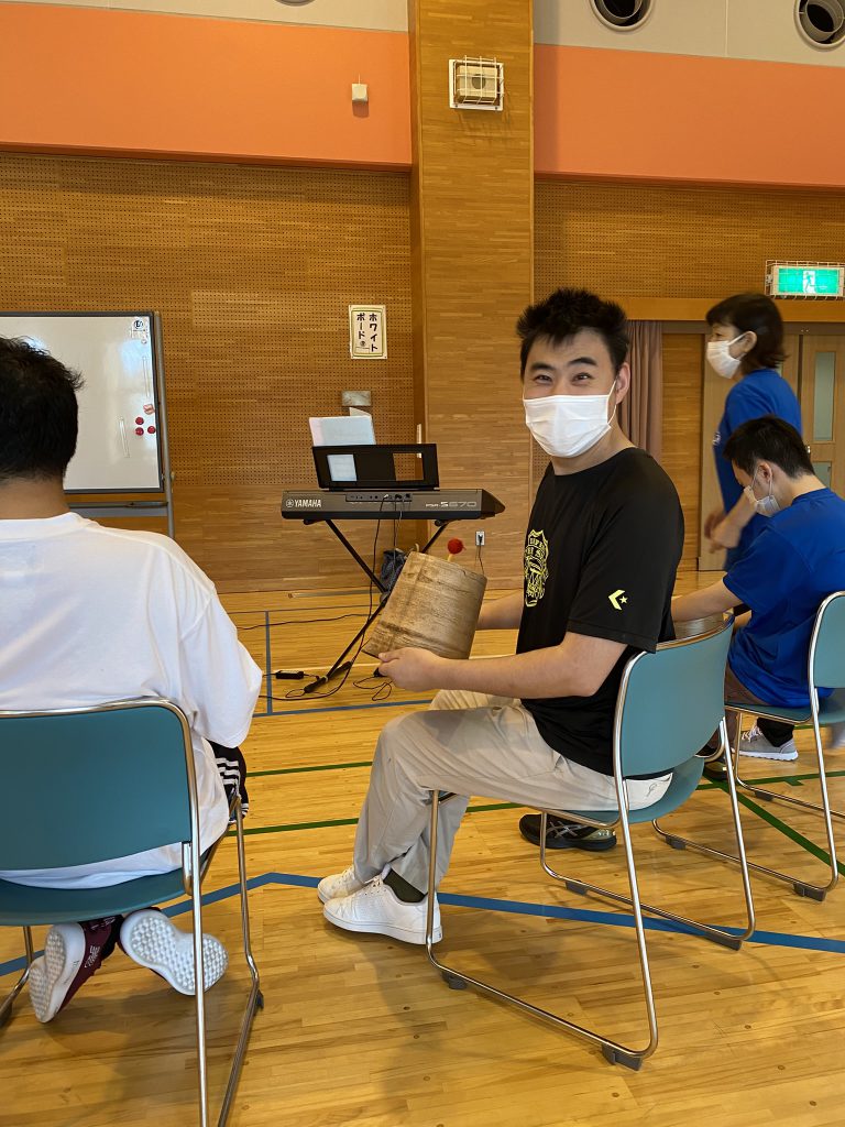 先生は、いつも、いろんな楽器を持ってきてくださいます。今日は、マジックテープ付のベルトに鈴が等間隔に並んでいる楽器(楽器名が分からないので、「マジックテープ鈴」と呼びます)をいくつもつないで、みんなで持ち、THE BOOM の「島唄」を歌いながら、曲に合わせて鳴らしました。