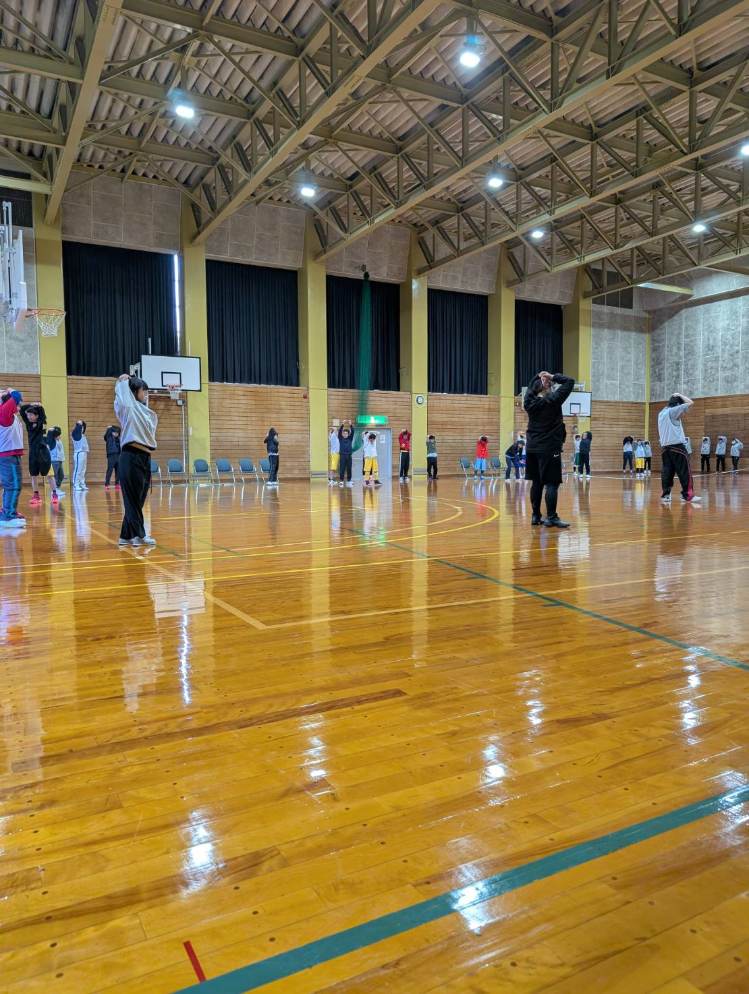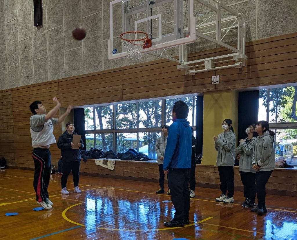 シュートは6ヶ所から2回ずつ打って、リングに当たったら1点、入ったら2点はいります。狙って真剣にシュートを打ちます。