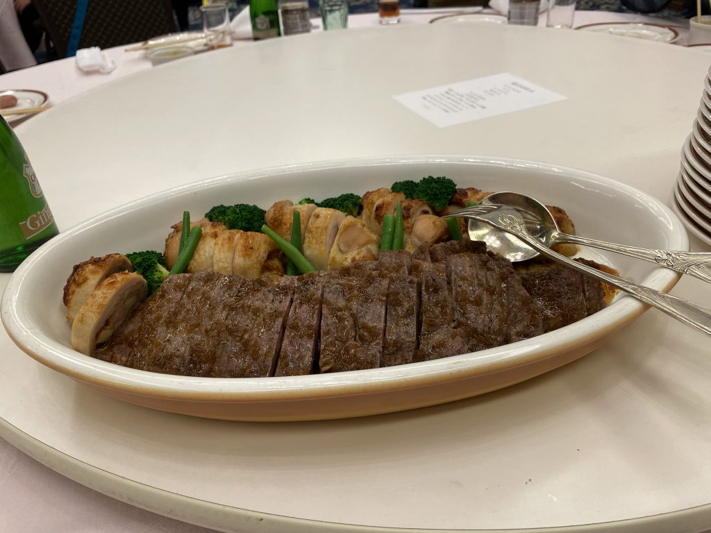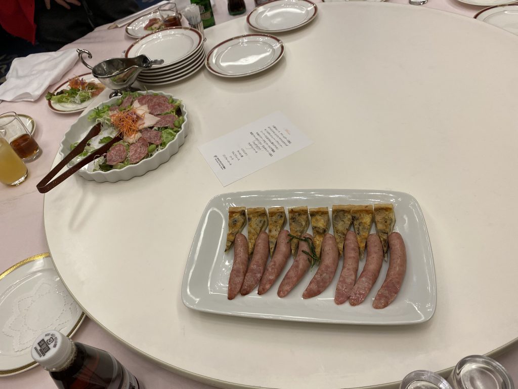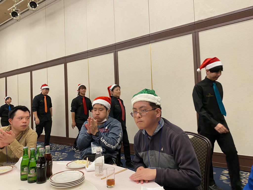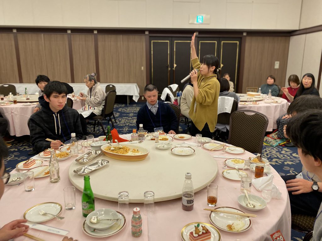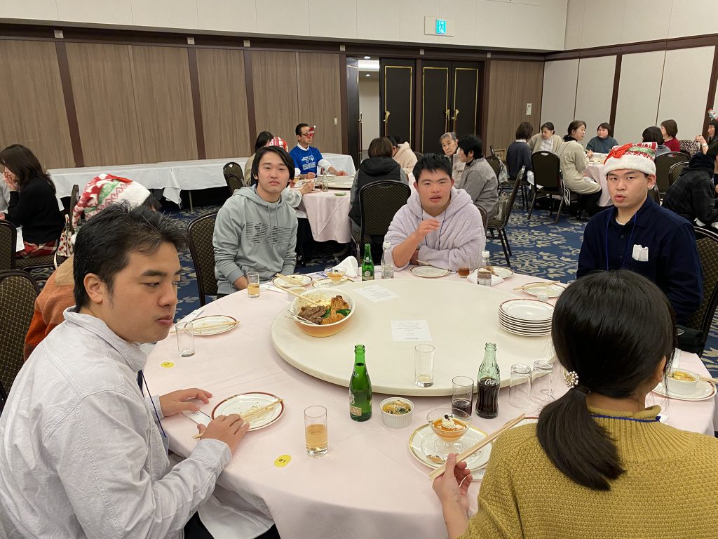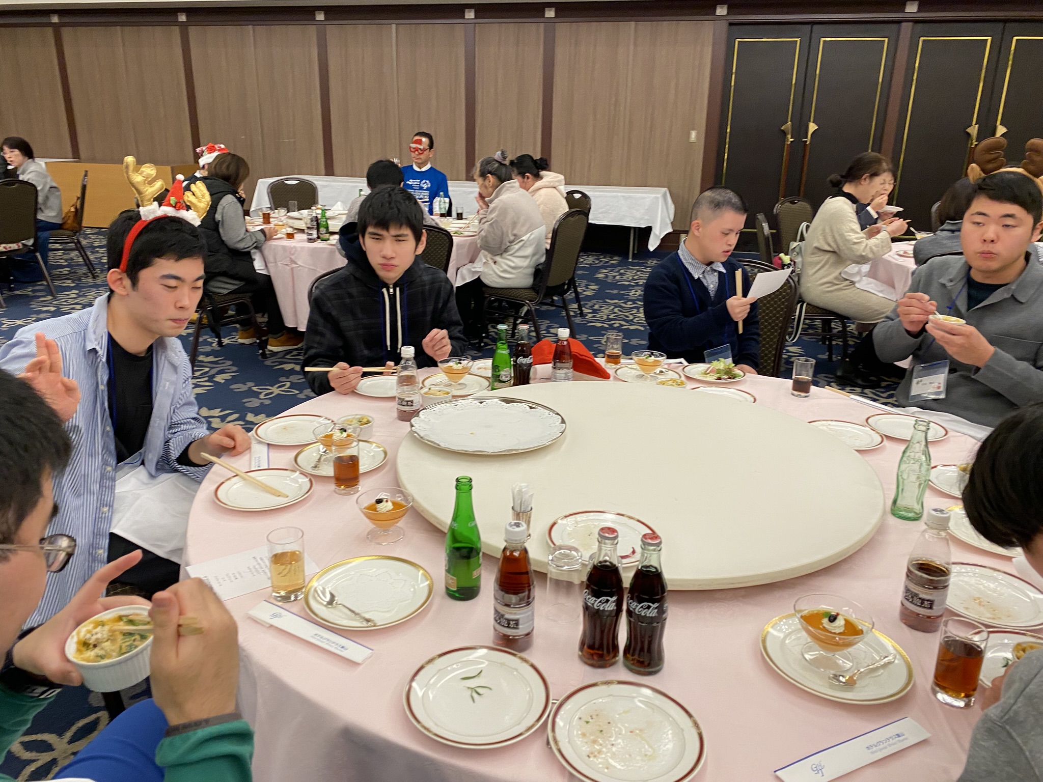 お食事の開始です。どんどん料理が運ばれてきます。今回のクリスマス会も、ファミリー席と、アスリート席が、ほぼ分かれていましたが、アスリートは、ちゃんと、自分たちで取り分けていましたよ。