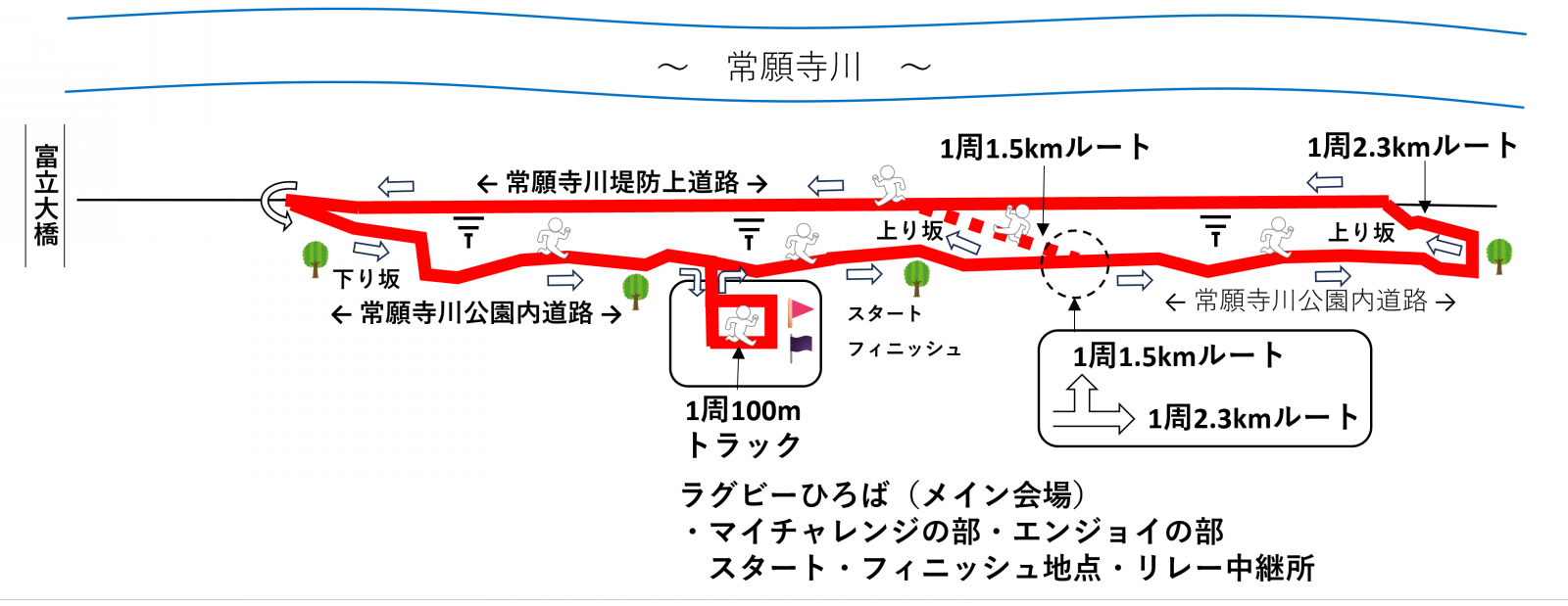 コース紹介です。今回選択したのはの部。 堤防上と公園内を走る周回コースです。2.3km、1.5kmのコース選択で距離を自由に当日決められます。