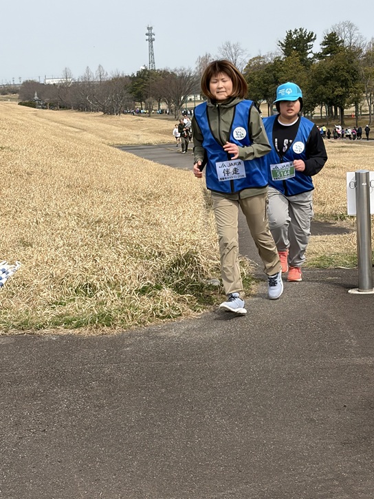 1.5㎞コースを選択したアスリートと伴走者が戻ってきました。力強い走りです。