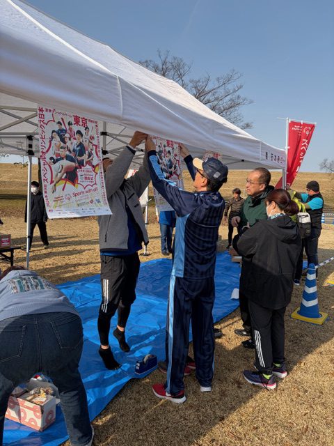 役員やファミリーは朝早くから現地入り。旗やテントをたてたり、机を並べたり、テキパキ作業を進めます。アスリートもシートを広げて手伝います。